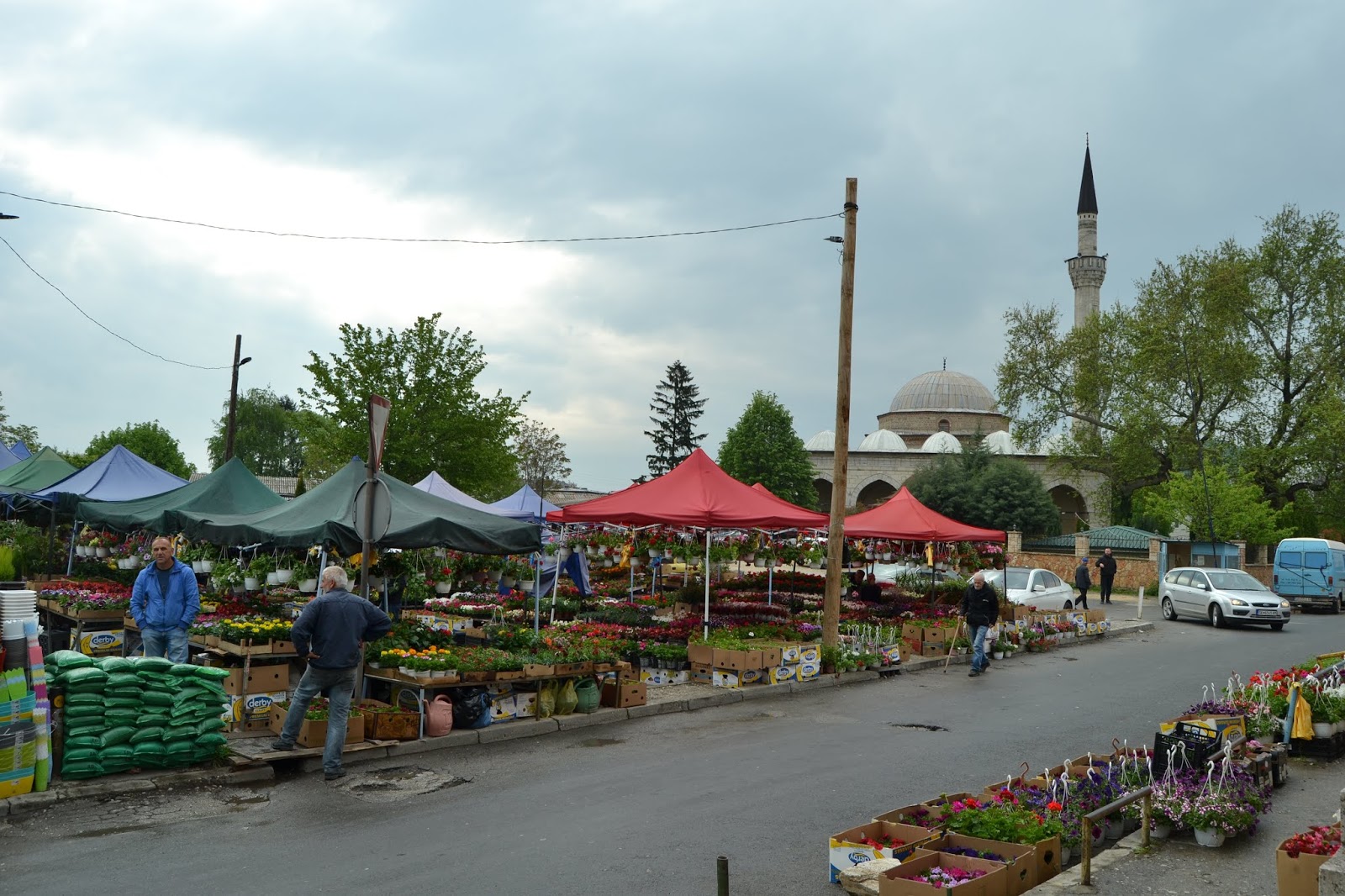 Skopje - Květinový trh a v pozdaí Isa Bey mešita (foto Žanet)